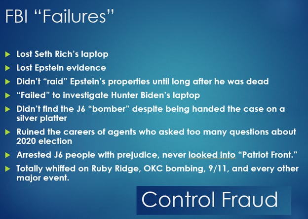From the above partial list of “failures” it’s patently clear that the FBI had somehow become the clean-up and cover-up arm of other agencies running their own frauds and illegal activities.
